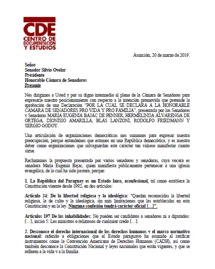 Carta del CDE al Senado ante Declaración Pro Vida y Pro Familia