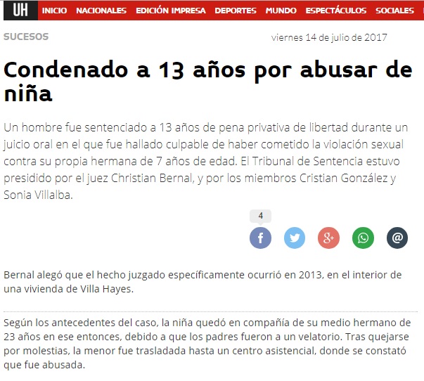 Página: 53 Fecha: 14 Jul 2017 Link:http://www.ultimahora.com/condenado-13-anos-abusar-nina-n1096363.html