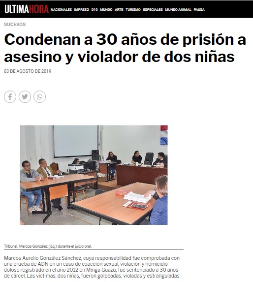 Página: 54 Fecha: 03 Ago 2019 Link:Condenan a 30 años de prisión a asesino y violador de dos niñas