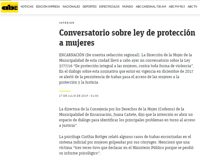 Link: https://www.abc.com.py/edicion-impresa/interior/2019/07/27/conversatorio-sobre-ley-de-proteccion-a-mujeres/link-VXGNM70X2N6EB65EY63H98AZCM/link-3BYFJG0Z1970N4YPA7ZZWTM9J4/