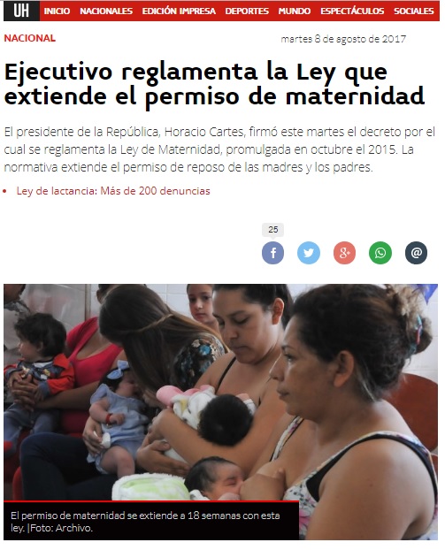 Página: Fecha: 08 Ago 2017 Link:http://www.ultimahora.com/ejecutivo-reglamenta-la-ley-que-extiende-el-permiso-maternidad-n1101024.html