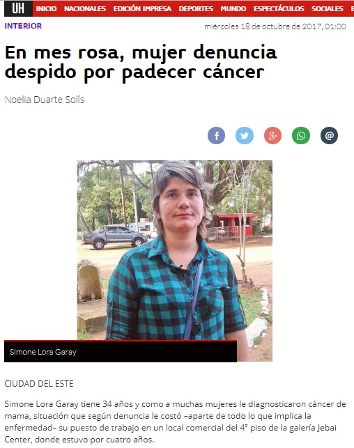 Página: 26 Fecha: 18 Oct 2017 Link:http://www.ultimahora.com/en-mes-rosa-mujer-denuncia-despido-padecer-cancer-n1113706.html