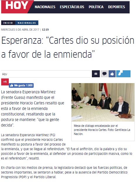 Link: http://www.hoy.com.py/nacionales/esperanza-cartes-dio-su-posicion-a-favor-de-la-enmienda