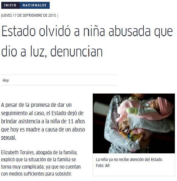 Página: Fecha: 17 Sep 2015 Link:http://www.hoy.com.py/nacionales/estado-olvid-a-nia-abusada-que-dio-a-luz-denuncian