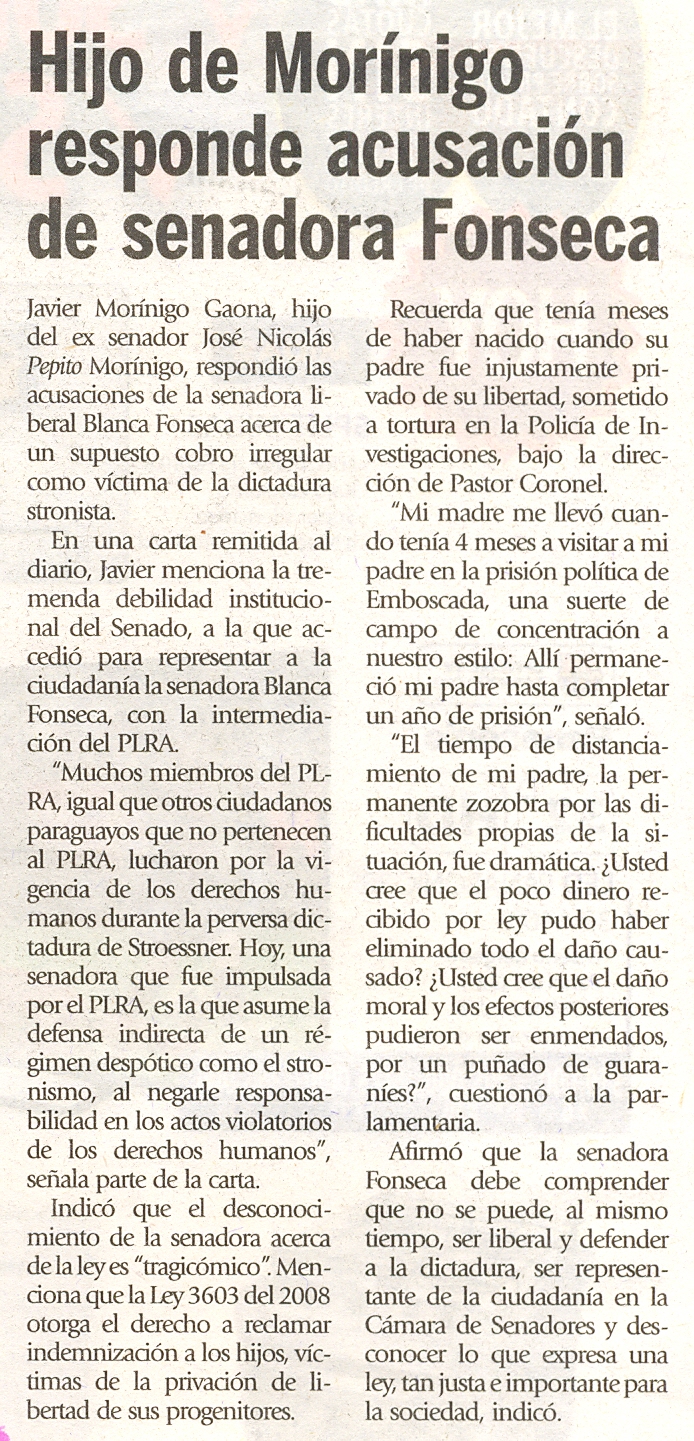 Hijo de Morínigo responde acusación de senadora Fonseca