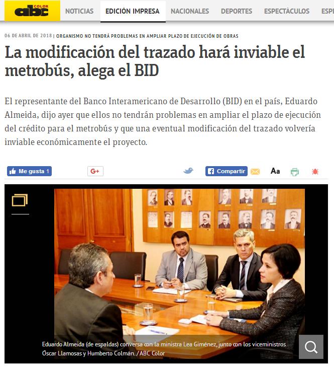 Link: http://www.abc.com.py/edicion-impresa/economia/la-modificacion-del-trazado-hara-inviable-el-metrobus-alega-el-bid-1690410.html