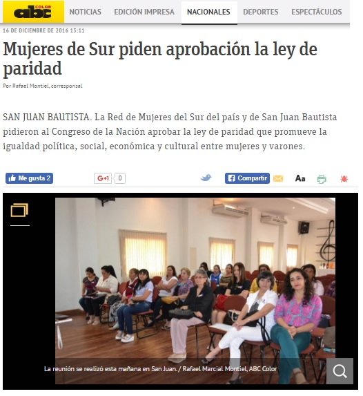 Página: Fecha: 16 Dic 2016 Link:http://www.abc.com.py/nacionales/mujeres-de-sur-piden-aprobacion-la-ley-de-paridad-1547733.html