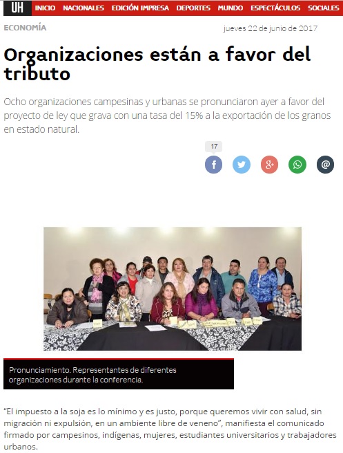 Página: 11 Fecha: 22 Jun 2017 Link:http://www.ultimahora.com/organizaciones-estan-favor-del-tributo-n1092387.html