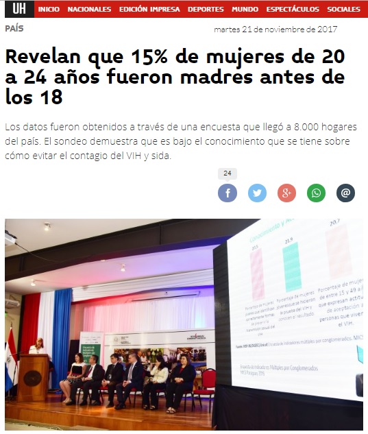 Página: Fecha: 21 Nov 2017 Link:http://www.ultimahora.com/revelan-que-15-mujeres-20-24-anos-fueron-madres-antes-los-18-n1120170.html