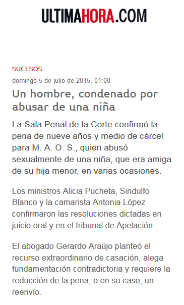 Página: 56 Fecha: 05 Jul 2015 Link:http://m.ultimahora.com/un-hombre-condenado-abusar-una-nina-n910603.html