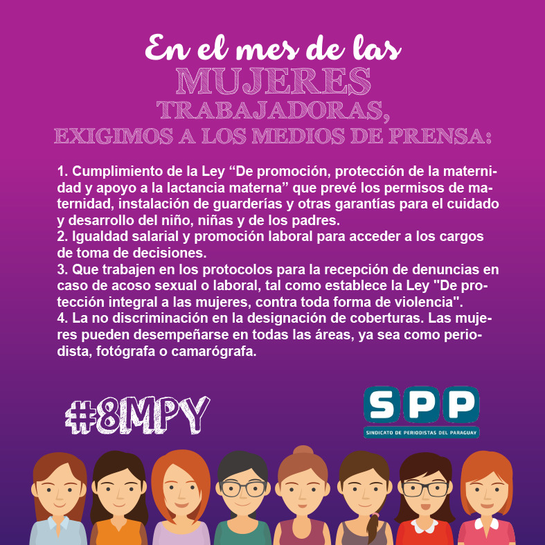 El Sindicato de Periodistas del Paraguay (SPP) se adhiere a la movilización de este jueves por el Día Internacional de la Mujer. La