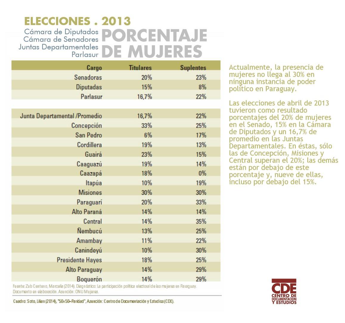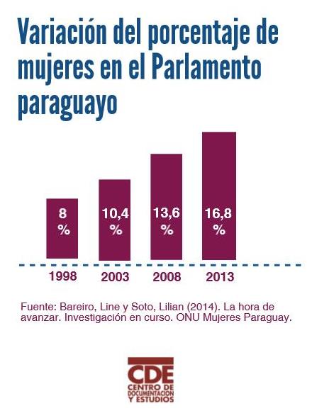 La participación política igualitaria de las mujeres es un reclamo que lleva más de dos décadas en Paraguay, con iniciativas de diversas características. En los años noventa la lucha fue por la obtención de las denominadas medidas especiales temporales o cuotas. El resultado fue la incorporación de esta medida en el Código Electoral aprobado en 1996, para las listas primarias de los partidos políticos, con un magro porcentaje del 20%.