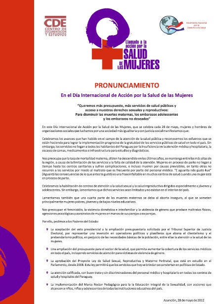 El presente pronunciamiento constituye un manifiesta presentado por el Centro de Documentación y Estudios (CDE) y el Movimiento Nacional por el Derecho a la Salud en el Día Internacional de Acción por la Salud de las Mujeres, que se celebra cada 28 de mayo.