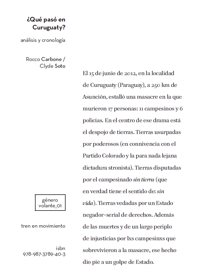 ¿Qué pasó en Curuguaty? Análisis y cronología de Rocco Carbone y Clyde Soto, publicado en Temperley, Argentina, por la editora Tren en Movimiento, en 2018.