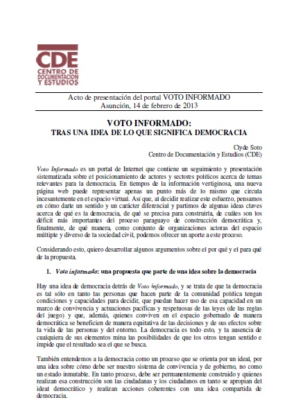 Voto informado es un portal de Internet que contiene un seguimiento y presentación sistematizada sobre el posicionamiento de actores y sectores políticos acerca de temas relevantes para la democracia. En tiempos de información vertiginosa, una nueva página puede representar apenas un punto más de lo mismo que circula incesantemente en el espacio virtual.